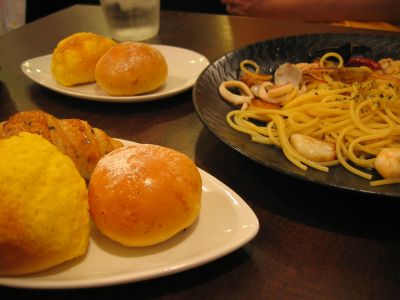 ここは、パスタの料金だけで食べ放題のパンがついてきて